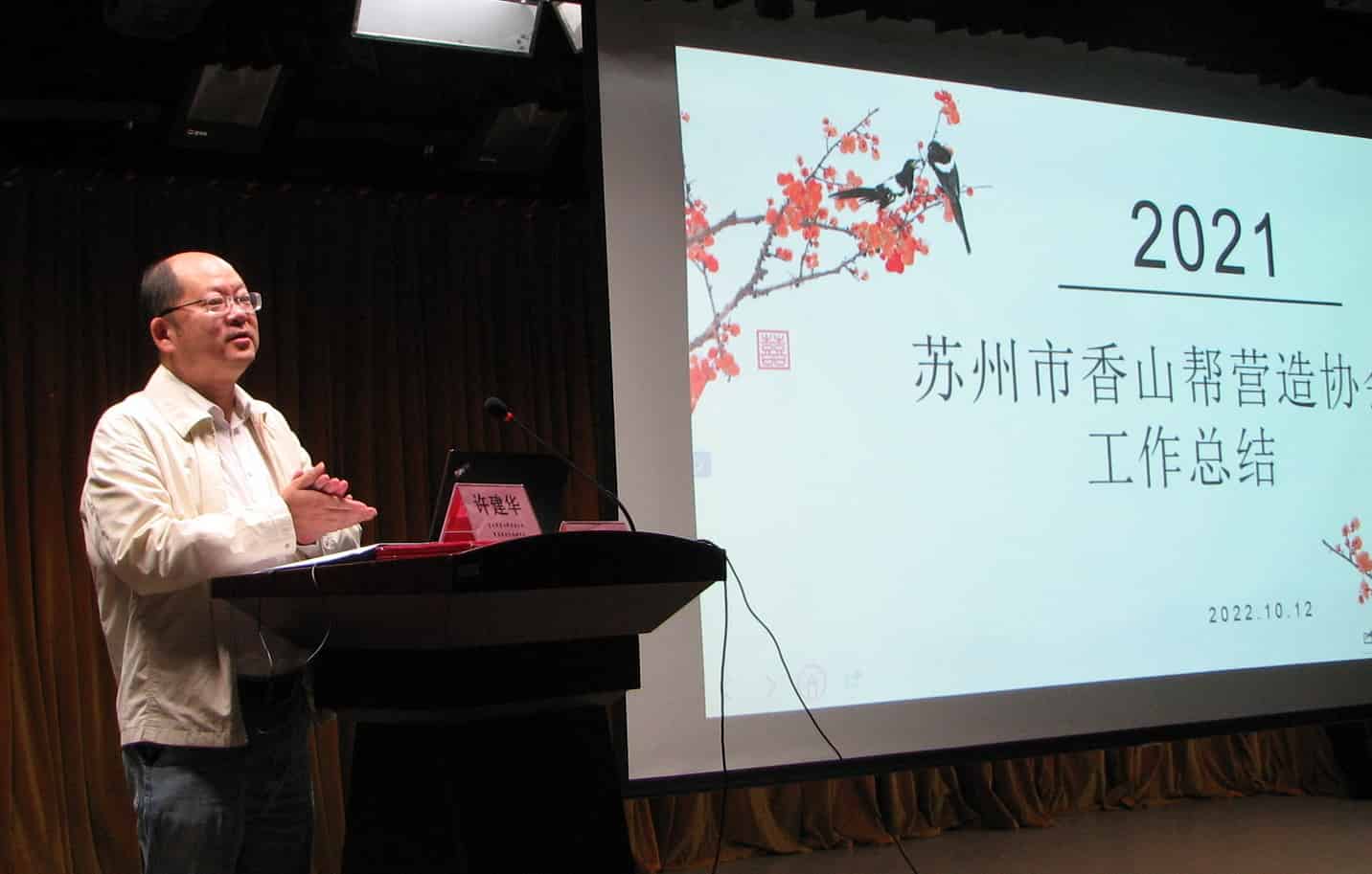 在党的二十大召开前夕,2022年10月12日苏州市香山帮营造协会2021年会在吴中区胥口镇胥口文体中心多功能厅召开。来自协会各会员单位的60多名会员代表参加了本次会议。大会主要有两部分内容:一是对协会在2021年度开展的各项工作进行总结和说明;二是对上年度取得突出成就的单位和个人进行表彰同时还对协会评出的“第四批香山帮技艺传承人”和第三届“香山杯”古建园林优质工程奖项目进行了授奖。