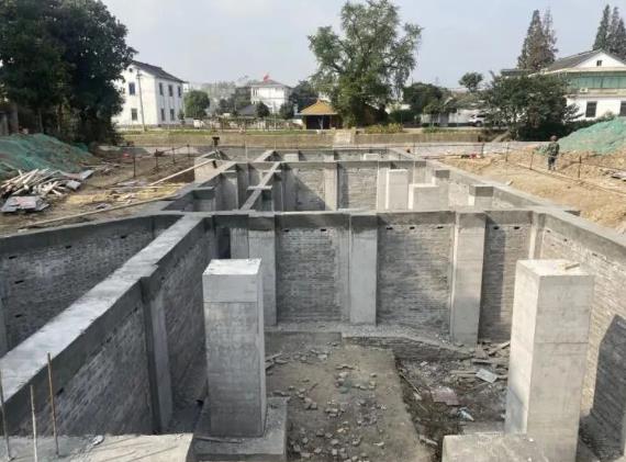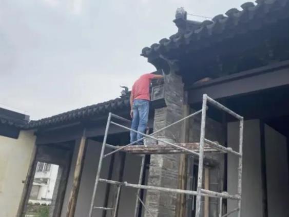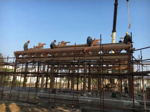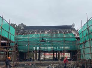 主体屋面阶段施工程序:待基础结构验收合格后进行施工。大木屋架安装→ 主体墙砌筑 →小青瓦屋面铺设。